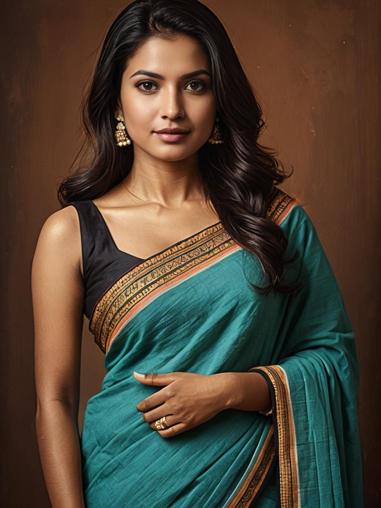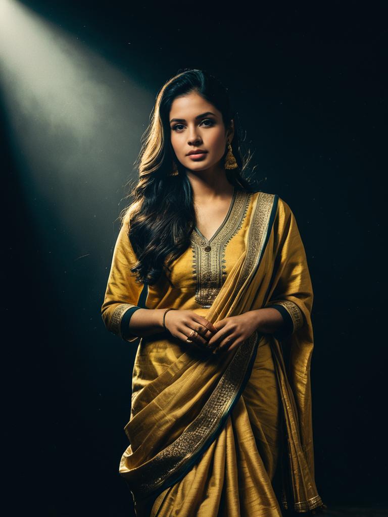 Woman in Dhoti Suit Salwar, photorealistic cultural fashion portrait, cinematic realism --sref 1393