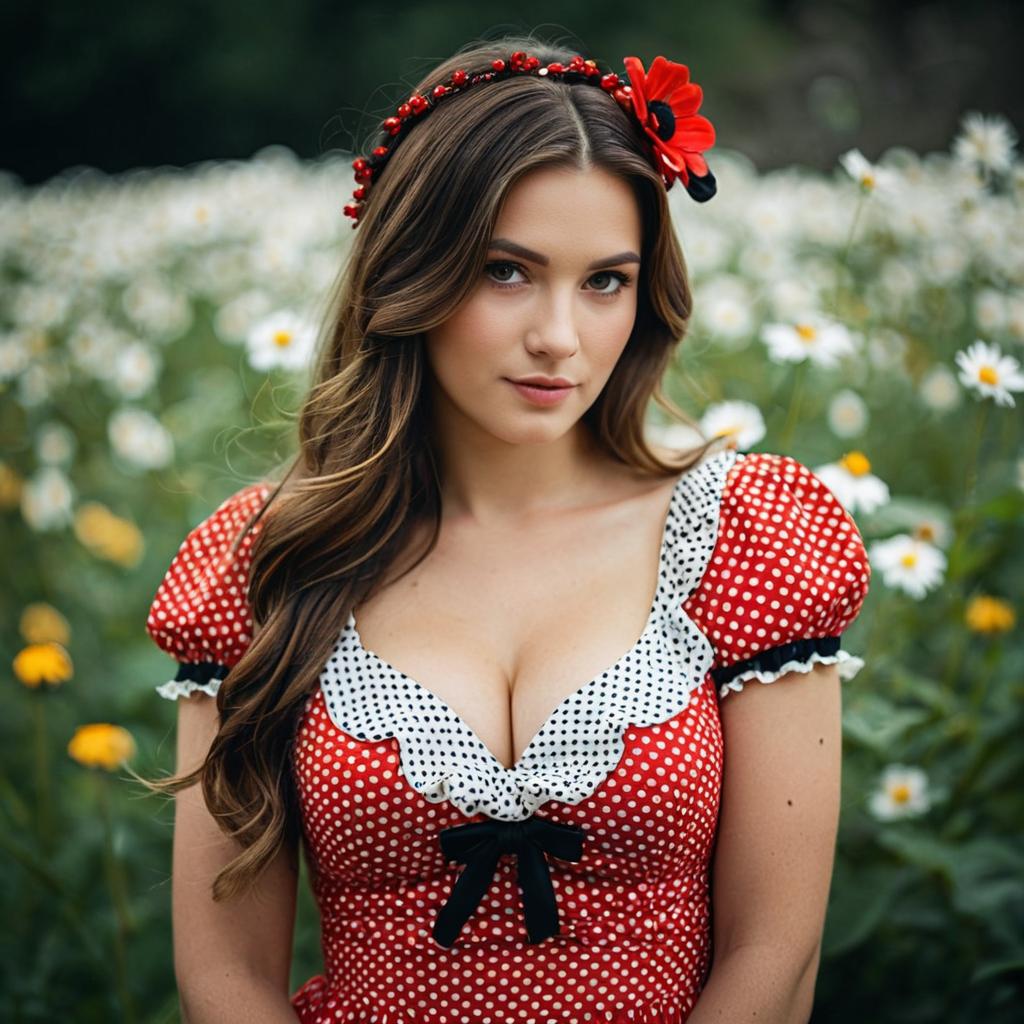Ladybird fancy costume,1girl, dress, solo, brown hair, red dress, flower, polka dot dress, looking at viewer, long hair, blurry, breasts, hair ornament, polka dot, blurry background, realistic, cleavage, short sleeves