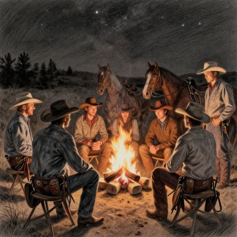 A digitally illustrated painting depicts seven cowboys seated around a glowing campfire at night. They wear cowboy hats, denim shirts, and boots, with saddles and holstered guns on the chairs. Two horses stand behind them, visible in the dim, starlit sky. The cowboys, diverse in age and appearance, sit in a circle, some holding cups and engaging in conversation. The background features a dark, grassy field with silhouetted trees. The firelight casts warm, flickering shadows on their faces and clothes, enhancing the rustic, western atmosphere. The texture of the illustration is rich and detailed, with a focus on the campfire's light and the cowboys' relaxed, communal gathering.