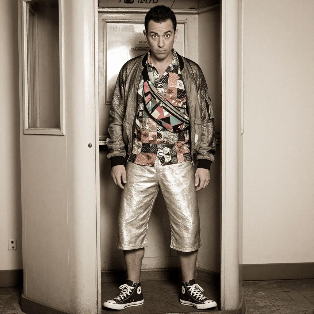 A man, colorful patchwork shirt, shimmering silver culottes, lightweight mesh bomber, retro high-top sneakers, geometric print fanny pack, vintage ticket booth, sepia effect, playful expression Man has masculine face and piercing eyes