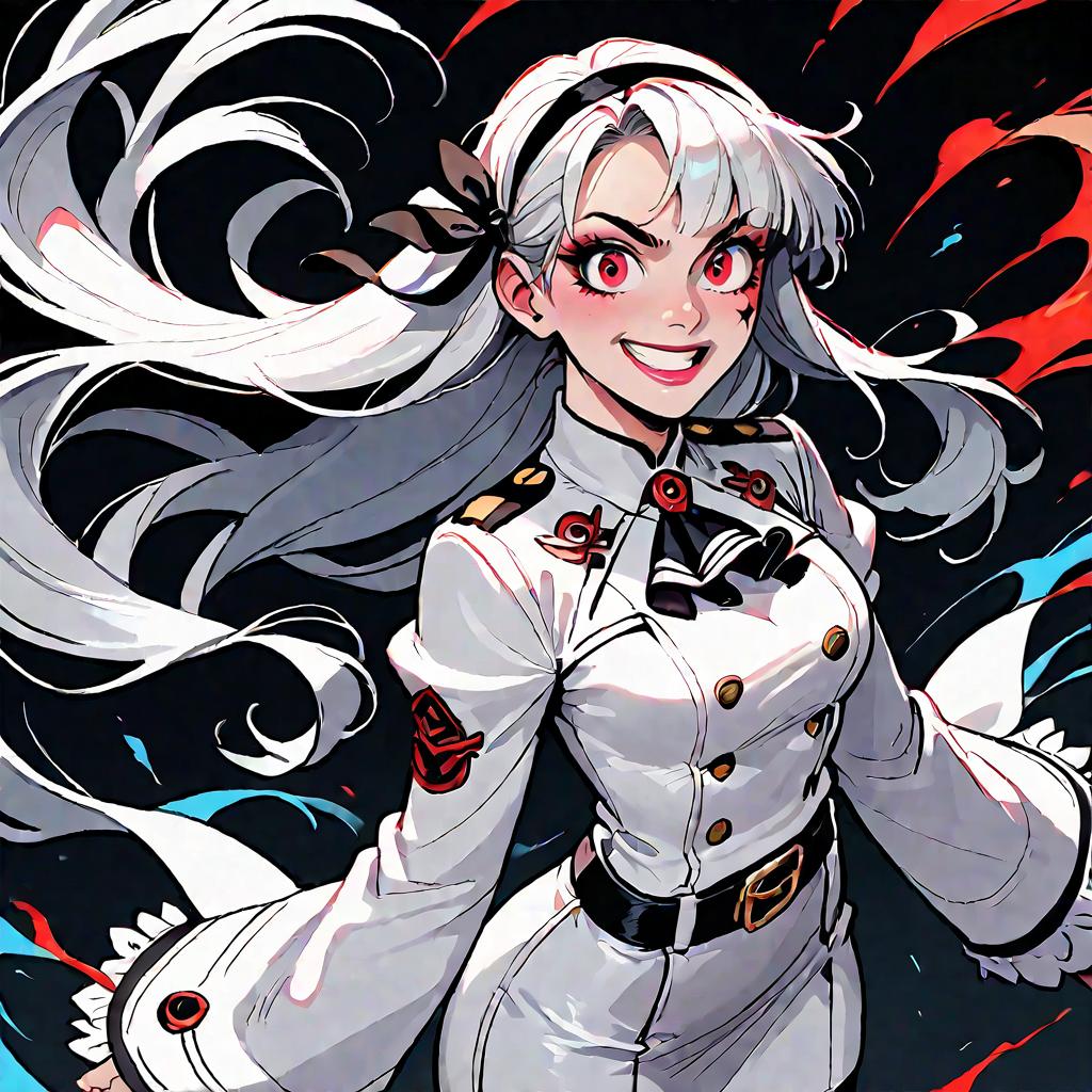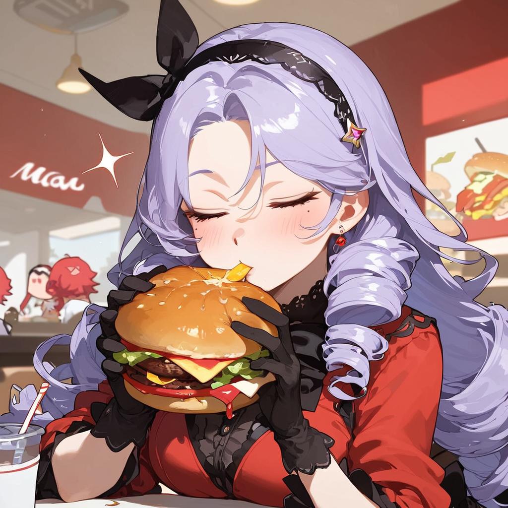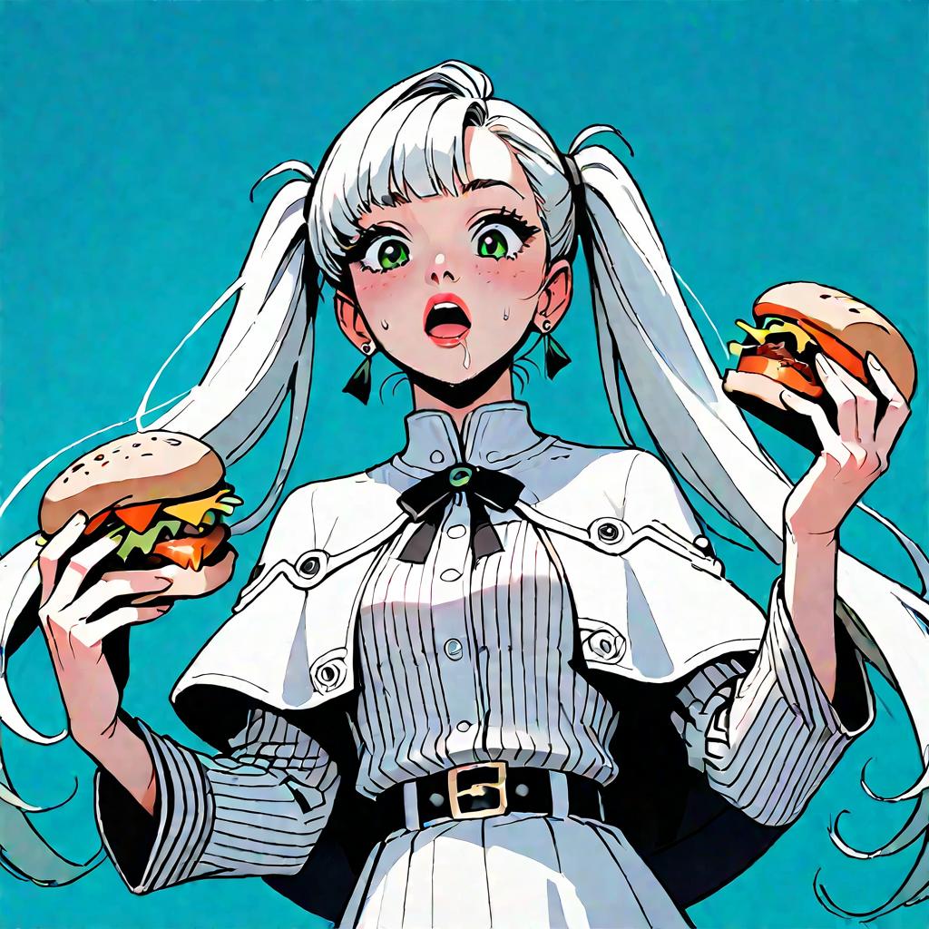 Score_9, score_8_up, score_7_up, source_ anime, 1girl, simple background, traditional art, lineart, green eyes, white hair, long hair, twintails, earrings, white capelet, striped shirt, long sleeves, belt, white skirt, black pantyhose, eating burger, looking down, drooling, open mouth