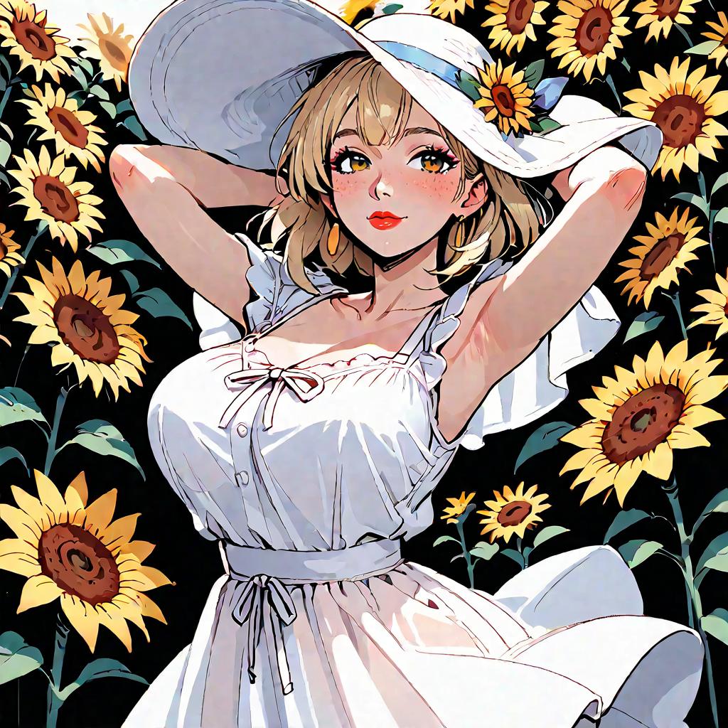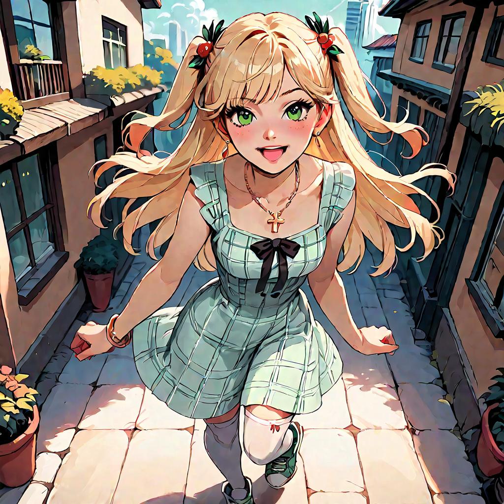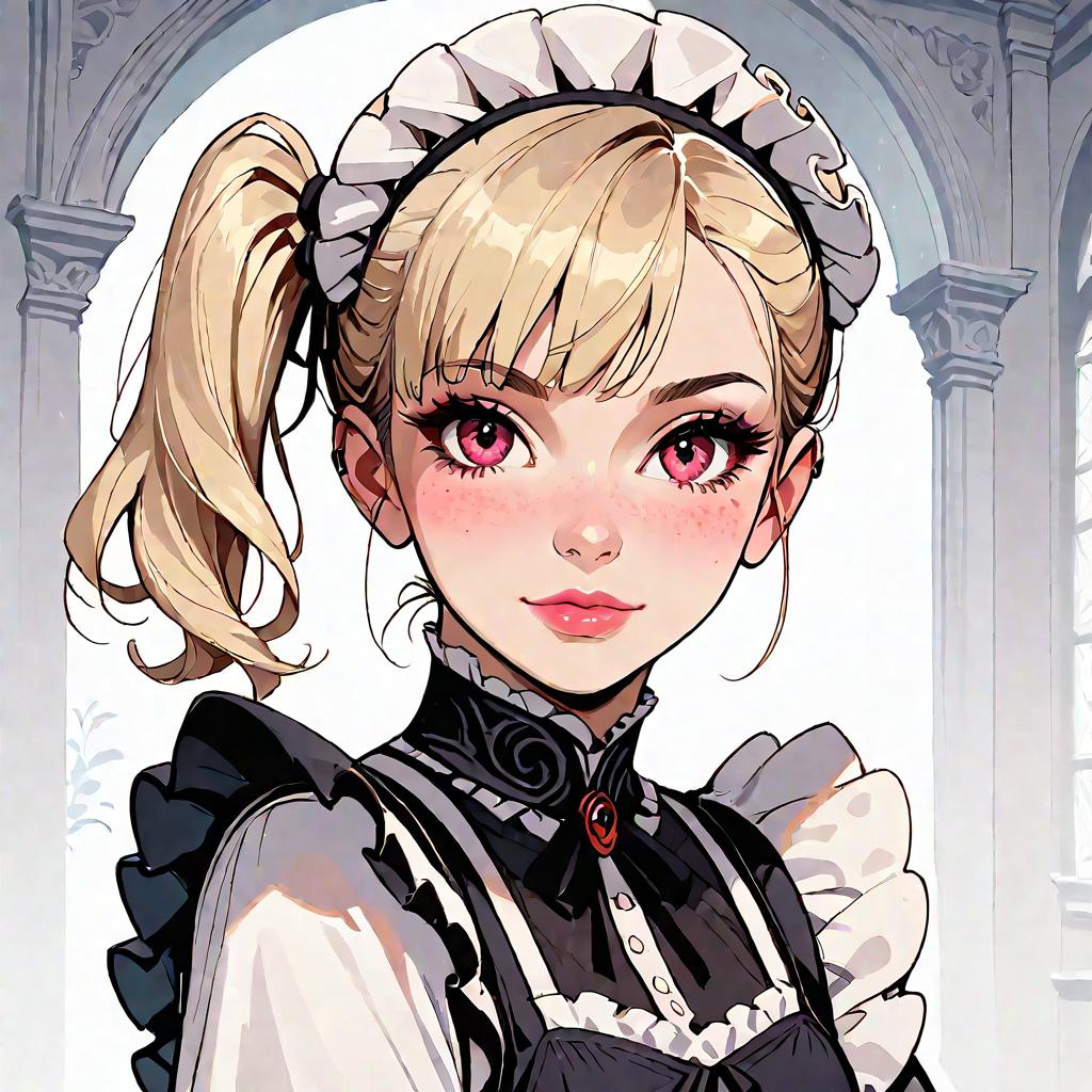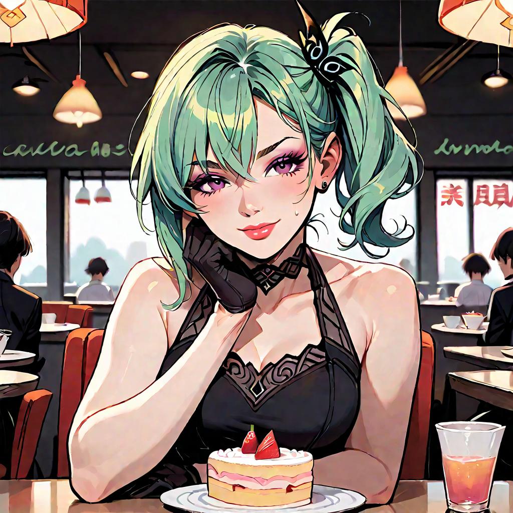Score_9, score_8_up, score_7_up, source_ anime, 1girl, simple background, traditional art, lineart, green eyes, white hair, long hair, twintails, earrings, white capelet, striped shirt, long sleeves, belt, white skirt, black pantyhose, eating burger, looking down, drooling, open mouth