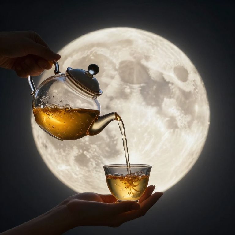 Silhouetted hands pour tea from a glass teapot into a cup against a bright, full moon in the dark night sky.
