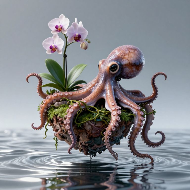 A mechanical octopus, its tentacles threaded with vines, tenderly cradles a floating island of endangered orchids above a reflective ocean of liquid mercury.