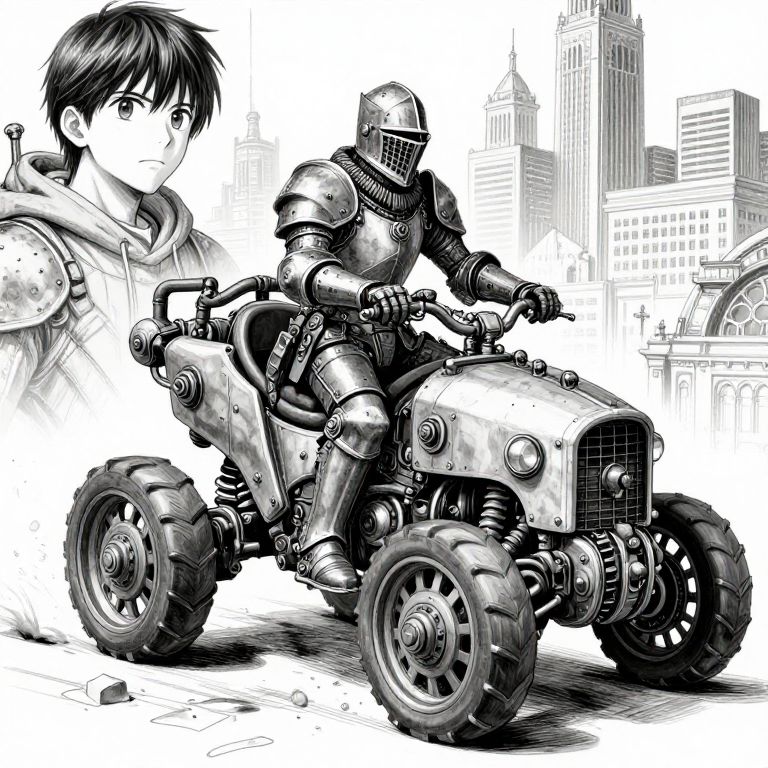 Black-and-white manga-style drawing of a medieval knight in armor riding a futuristic all-terrain vehicle, with a youthful character's face in the background,