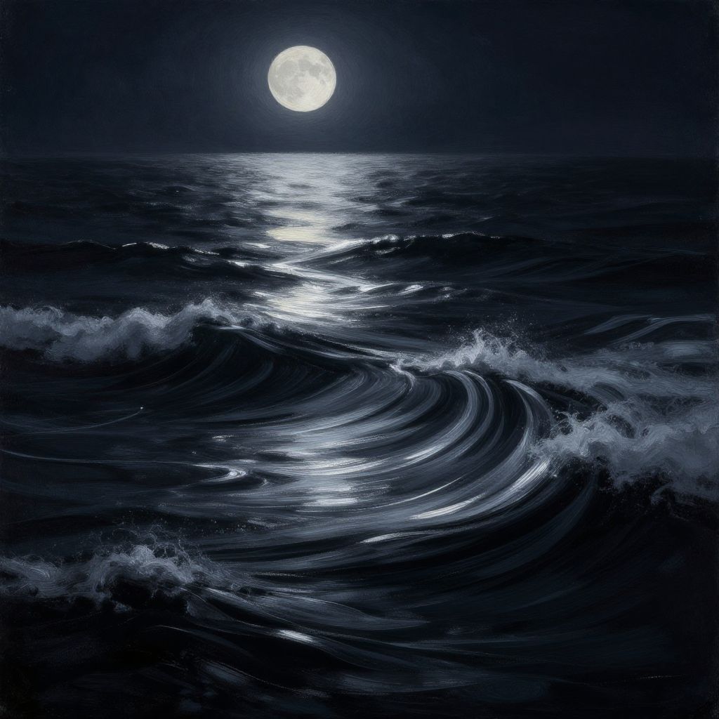 A digital artwork depicts a dark, moonlit ocean. The full moon, shining brightly in the upper left, casts a silver reflection across the waves. The water, rendered in deep blues and blacks, has swirling patterns and small white-capped waves. The texture of the water is smooth yet dynamic, highlighting the moonlight's path. The sky is pitch black, emphasizing the moon's luminosity. The overall mood is tranquil yet mysterious, with the interplay of light and shadow creating a serene, almost ethereal atmosphere.