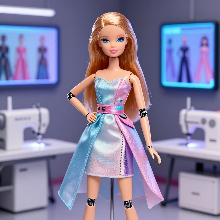 A robot Barbie doll posed gracefully inside a high-tech fashion studio, wearing a cyberpunk style dress blending metallic and pastel fabrics, with holographic makeup and robotic limbs, surrounded by futuristic sewing machines and screens displaying fashion holograms.