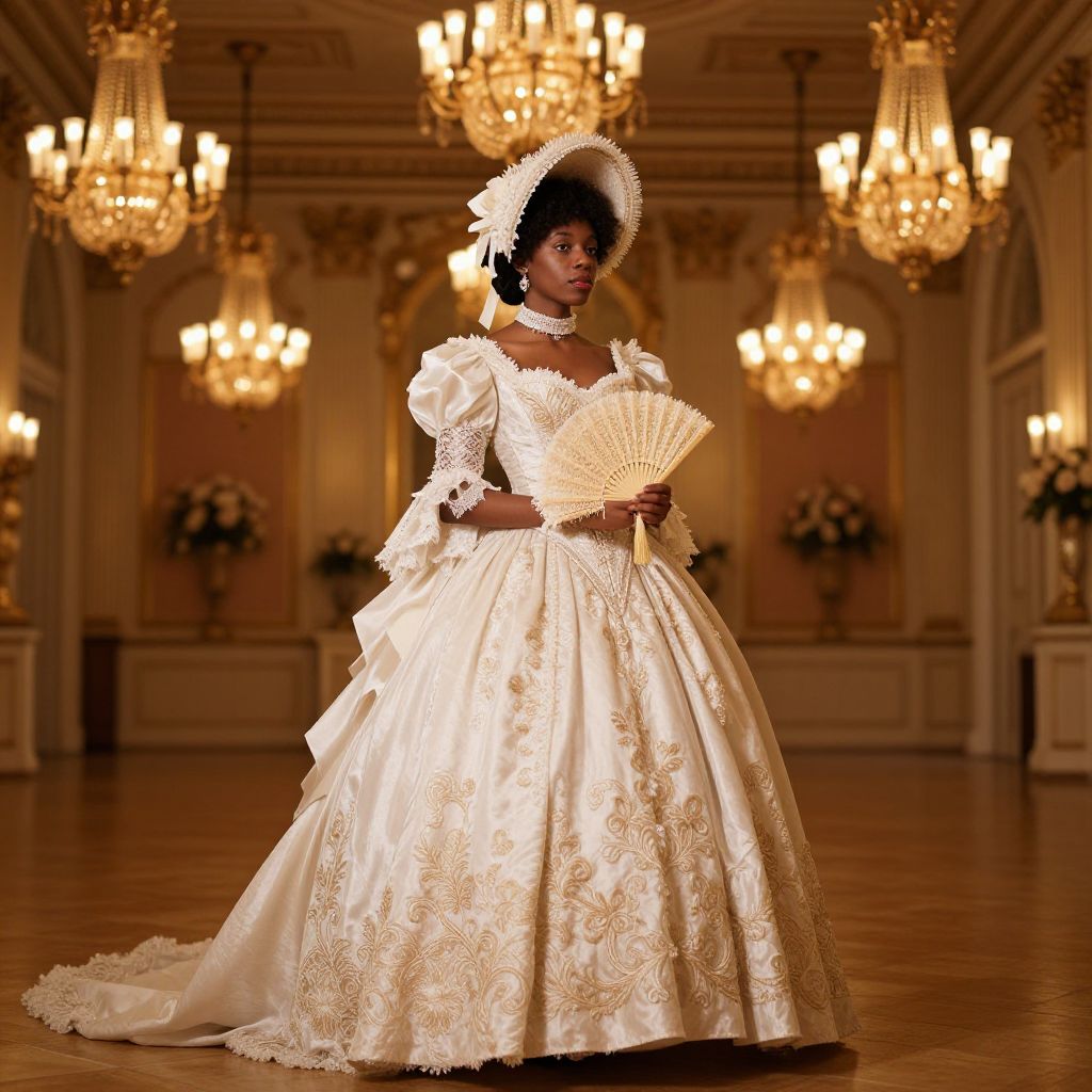 Victorian black woman in a grand ballroom wearing a lavish ball gown with detailed embroidery and a delicate bonnet, holding a delicate fan, vintage chandeliers casting a warm glow, opulent decor and rich textures all around, expressing dignity and sophistication.