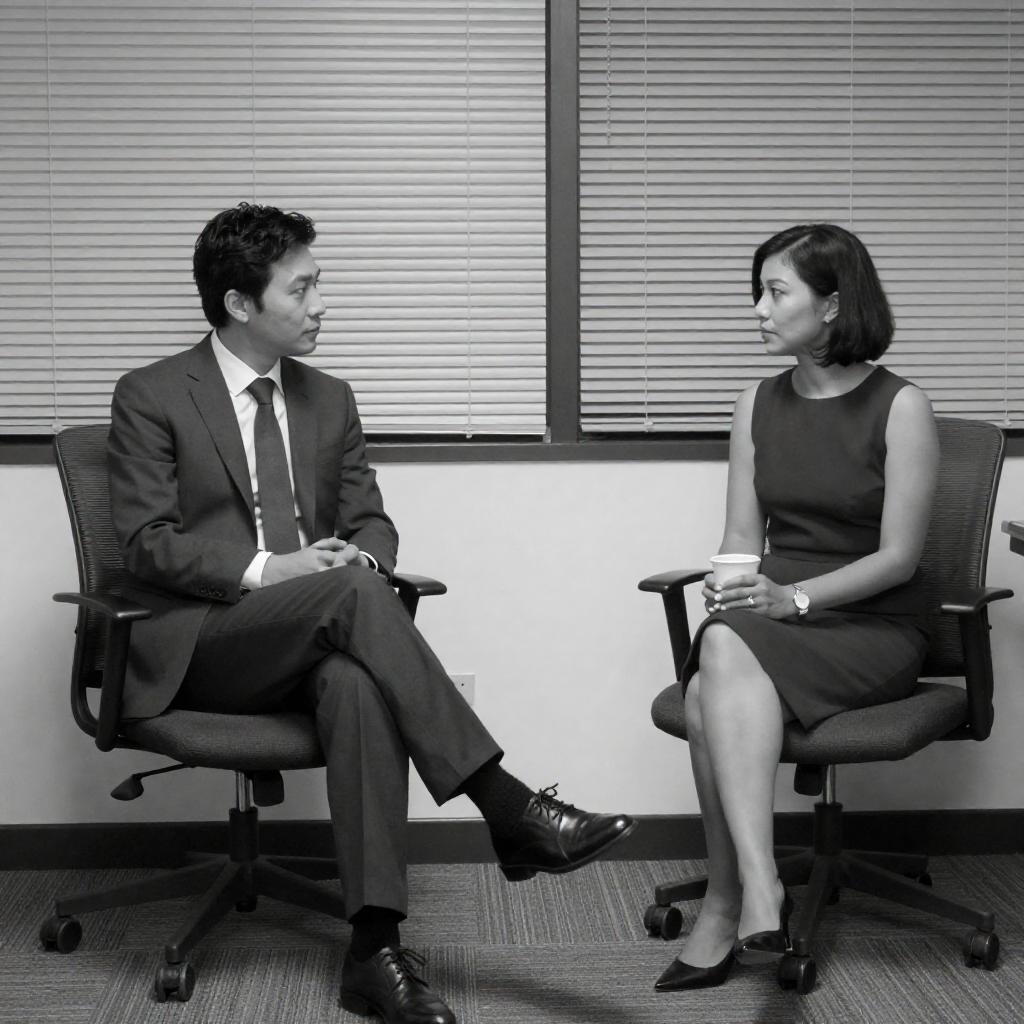 Black and white photograph of a man and woman sitting in an office-like setting. Man in a suit with dark hair, crossed legs, looking at the woman. Woman in a sleeveless dress with short dark hair, holding a cup, looking at the man. Blinds in the background, wooden chairs, and a carpeted floor. Man has a serious expression, woman has a neutral expression. Both seated on separate chairs, facing each other.