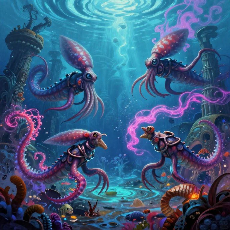 Squidwars fantasy underwater arena where giant squids compete in combat, vibrant glowing inks swirling around, deep sea plants and ruins in background, highly detailed marine creatures, dynamic poses, colorful and atmospheric painting style