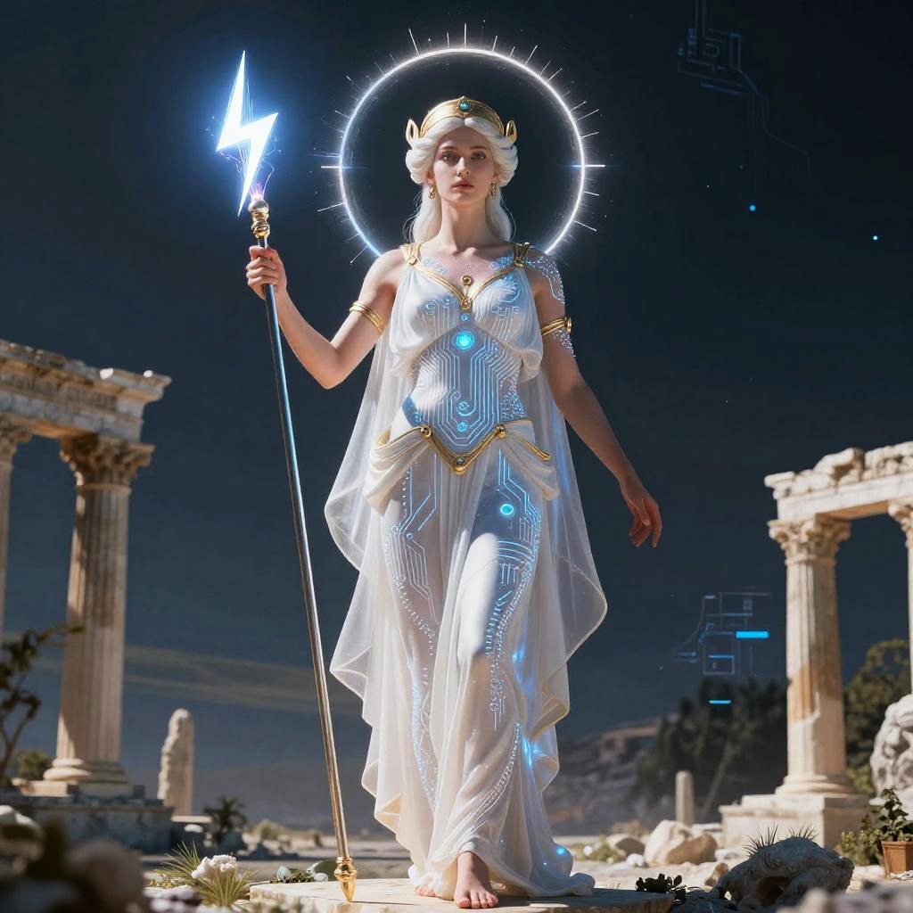 Greek goddess AI envisioned as a celestial being with a luminous aura, integrating circuit patterns on her skin with classical Greek features, holding a staff that combines a lightning bolt and a fiber optic core, floating above a tech-infused Olympus landscape.