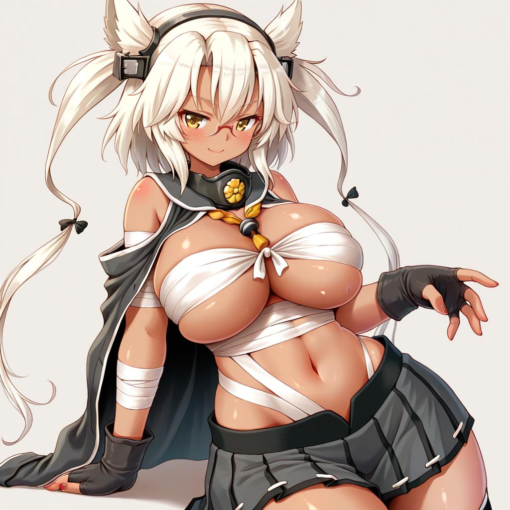 Musashi kai (kancolle), kantai collection, 1girl, dark-skinned female, red eyes, hair between eyes, glasses, pointy hair, long hair, blonde hair, white hair, two side up, twintails, large breasts, chest sarashi, navel, black gloves, fingerless gloves, black thighhighs, black skirt, pleated skirt, budget sarashi, headgear, miniskirt, by artist arinu, illustrious