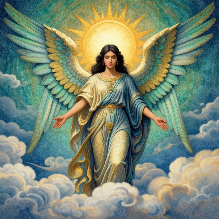 Digital illustration of a radiant, dark-haired angel with blue-green wings, golden halo, and white-blue robe, standing on clouds against a sunlit sky