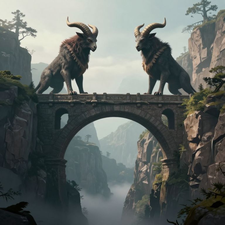 Digital artwork of two large, horned, mythical creatures facing each other on a stone arch bridge between towering, mist-covered cliffs.