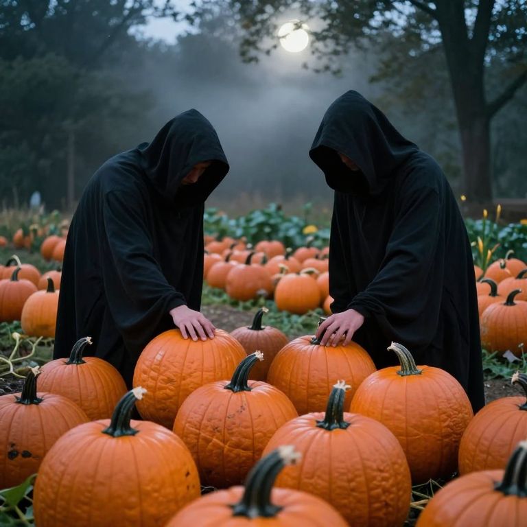 Photograph of two robed figures in black hoods standing in a foggy pumpkin patch at twilight. Both figures, with pale hands visible, are gently touching bright orange pumpkins scattered across the ground. The background is blurred with tall trees and a misty, moonlit sky. The pumpkins are round with textured surfaces and dark green stems. The scene has a mysterious, almost eerie atmosphere, with the robed figures adding a sense of intrigue and secrecy. The overall color palette includes the vivid oranges of the pumpkins, the dark black of the robes, and the muted greens and blues of the foggy background.