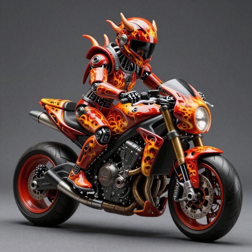 Cinematic photo-realistic, a Carved porcelain cyborg demons with aspects of a motorcycle such as handlebars on his shoulders, exhaust pipes on his forearms and legs, two tire wheels instead of feet, a head resembling a motorcycle helmet and a fiery paint job color scheme, in cyberpunk 2077 style, 16K resolution, macro resolution