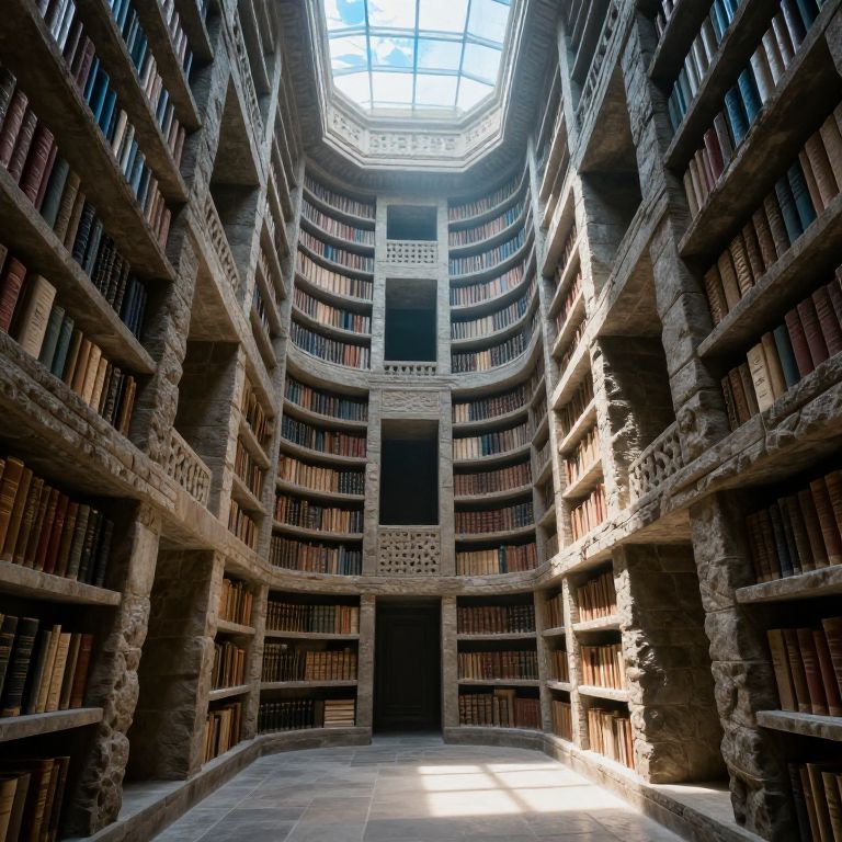 A labyrinthine library carved into ancient stone, its endless aisles illuminated by ethereal light filtering through a celestial skylight, casting an otherworldly glow over rows of books that seem to pulse with forgotten knowledge.