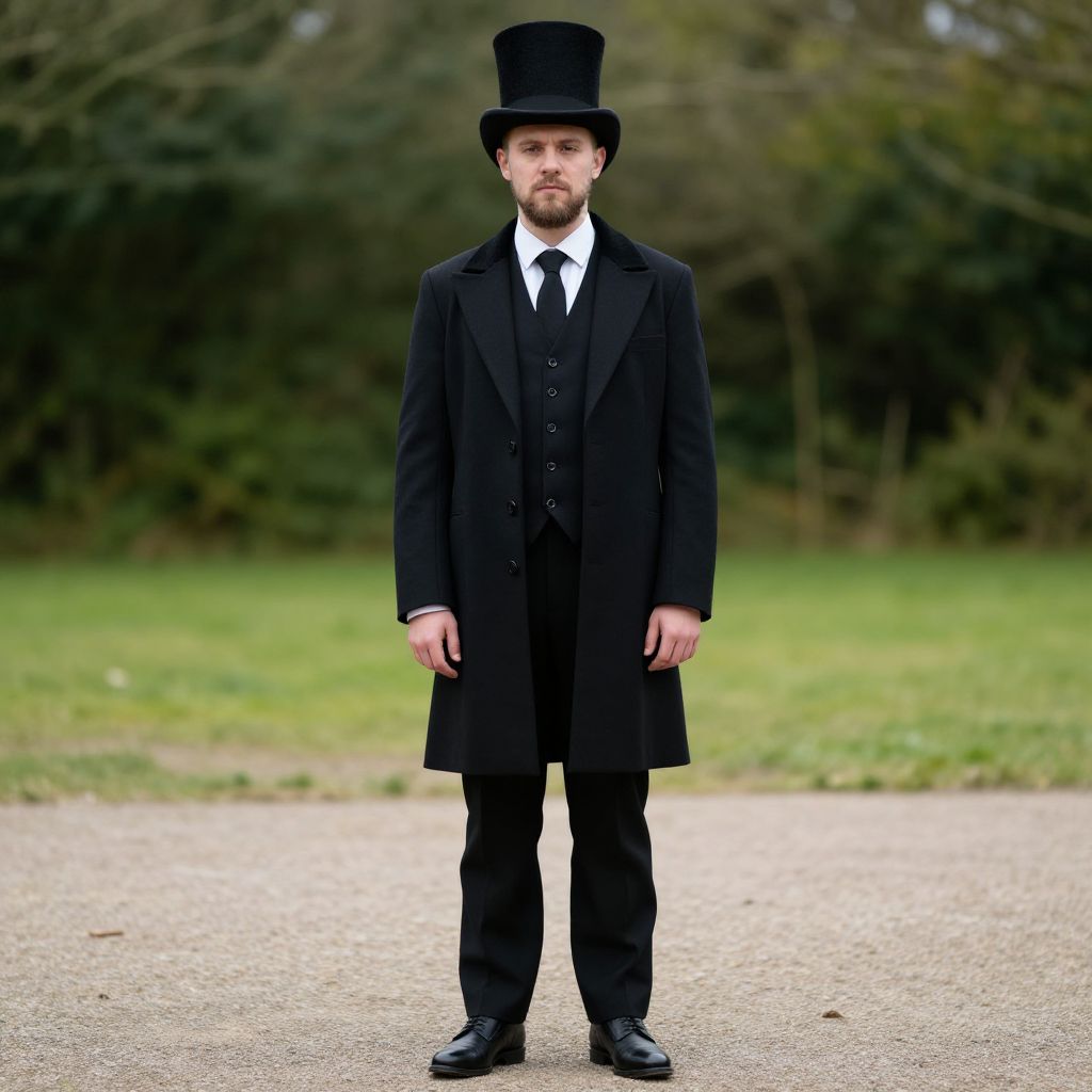 Photograph of a Caucasian man standing on a paved path in an outdoor setting with a blurred green grassy background and trees. He has light skin, short brown hair, and a trimmed beard. He is wearing a black top hat, black three-piece suit with a long overcoat, white dress shirt, and black tie. His black shoes are polished. He stands with a neutral expression, arms slightly away from his body, and looks directly at the camera. The overall style is reminiscent of 19th-century Victorian attire. The image has a slightly overcast lighting.