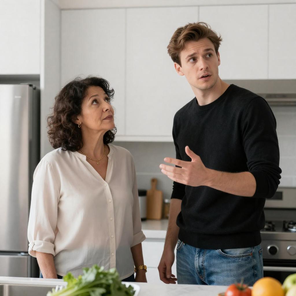 Older woman with curly white hair and glasses, wearing a blue top, kneeling on wooden floor. Younger man with curly brown hair, black clothing, pointing forward, kneeling behind her. Cozy room with wooden furniture, bookshelves, and framed pictures. Warm lighting. Intense expressions on both faces.