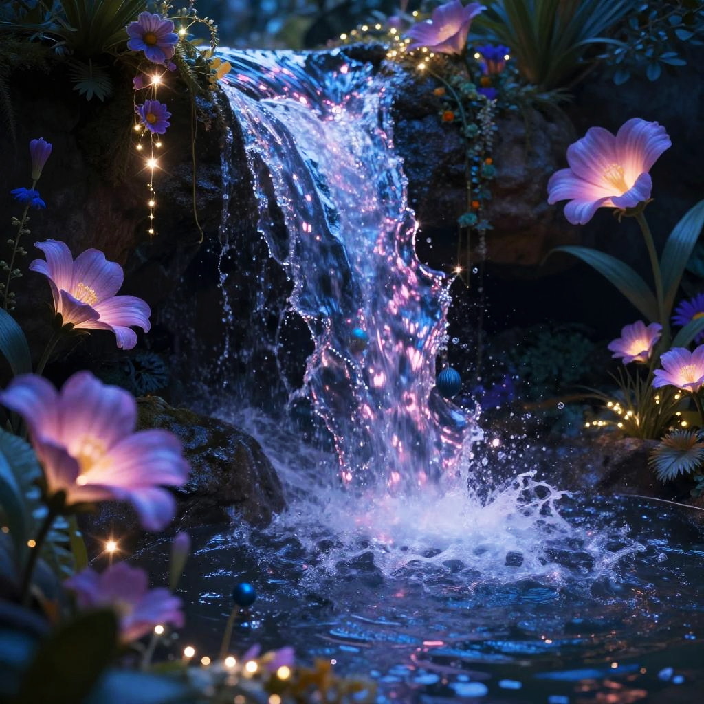 A shimmering purple|pink|blue waterfall amongst strange magical flowers, night time, sparkling fairy lights, magical, realistic water, ripples, 8k