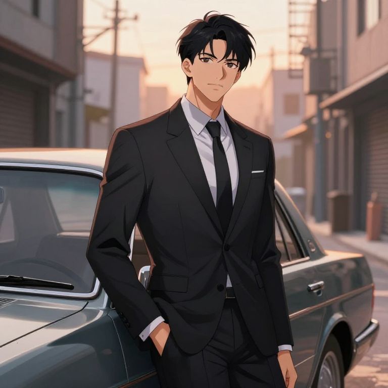 Anime boy suit, charismatic male character wearing a tailored black suit with a skinny tie, leaning against a vintage car in an urban alley, sunset lighting, soft shading, anime illustration with a cinematic atmosphere