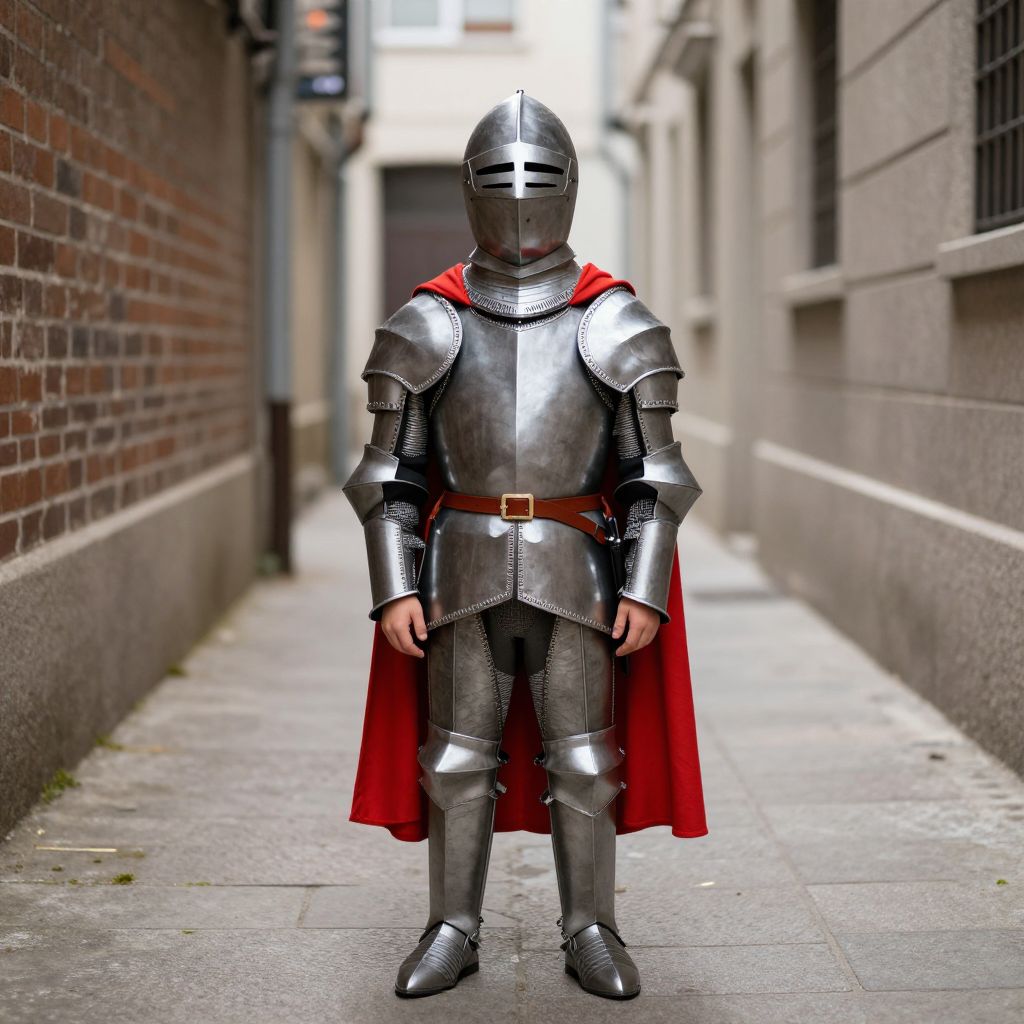Diy Tin Boy, boy in a knight costume standing in a narrow alleyway