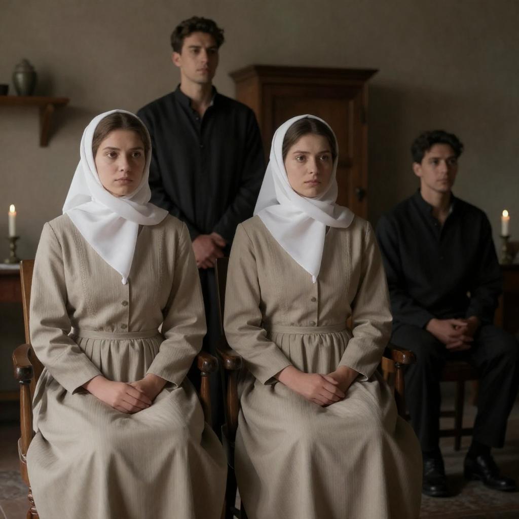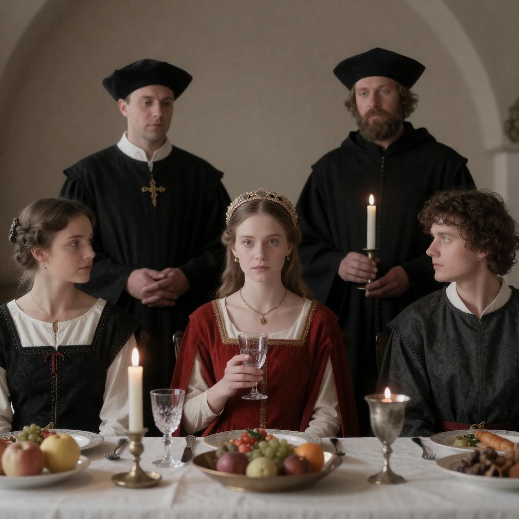 Photograph of a Victorian-era dinner scene with eight people, including men in dark suits and women in patterned dresses and a nun-like figure with a white veil. A young girl in a red checkered dress sits at a table with a lit candle, surrounded by the group. The background features dark wooden walls and a hanging lamp.