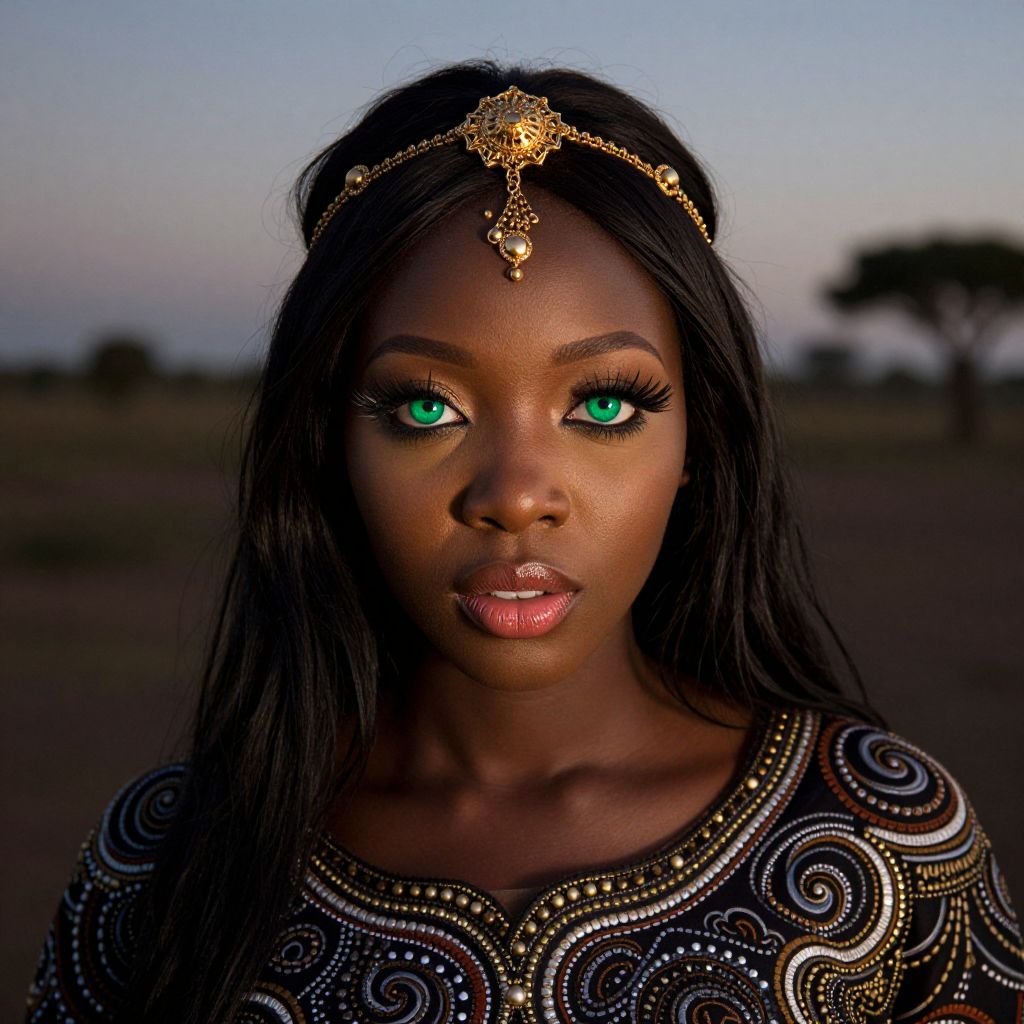 Photograph of a dark-skinned woman with striking green eyes, wearing a gold headpiece, intricate black and silver patterned top, against a twilight