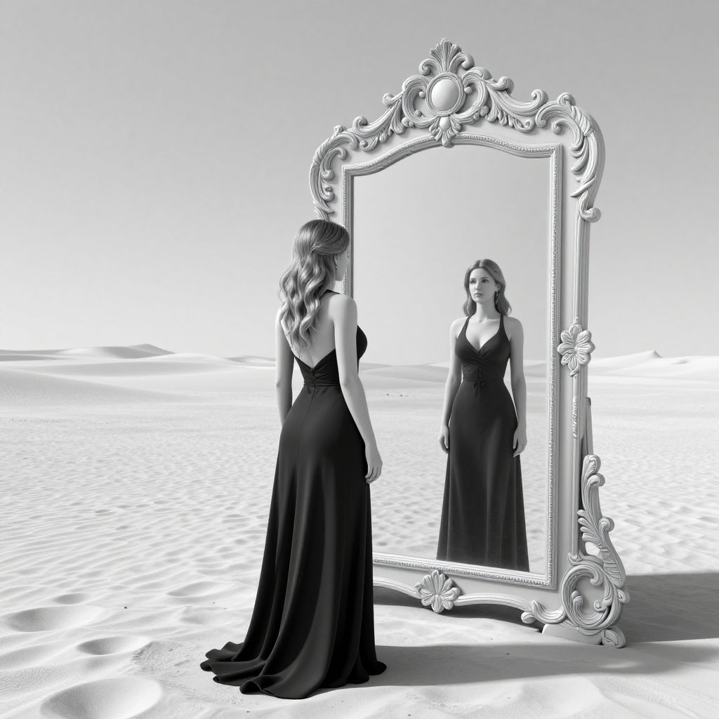 A black-and-white photograph depicts a woman with long, wavy hair standing in front of an ornate, vintage-style mirror. She wears a sleeveless, floor-length black gown with a deep V-neck, reflecting her back and front in the mirror. The background is a stark, empty desert landscape with smooth, undulating sand dunes extending to the horizon. The mirror's elaborate frame features intricate floral and scrollwork designs, contrasting with the simplicity of the desert. The woman gazes at her reflection with a contemplative expression, creating a striking visual contrast between her elegant attire and the barren surroundings.