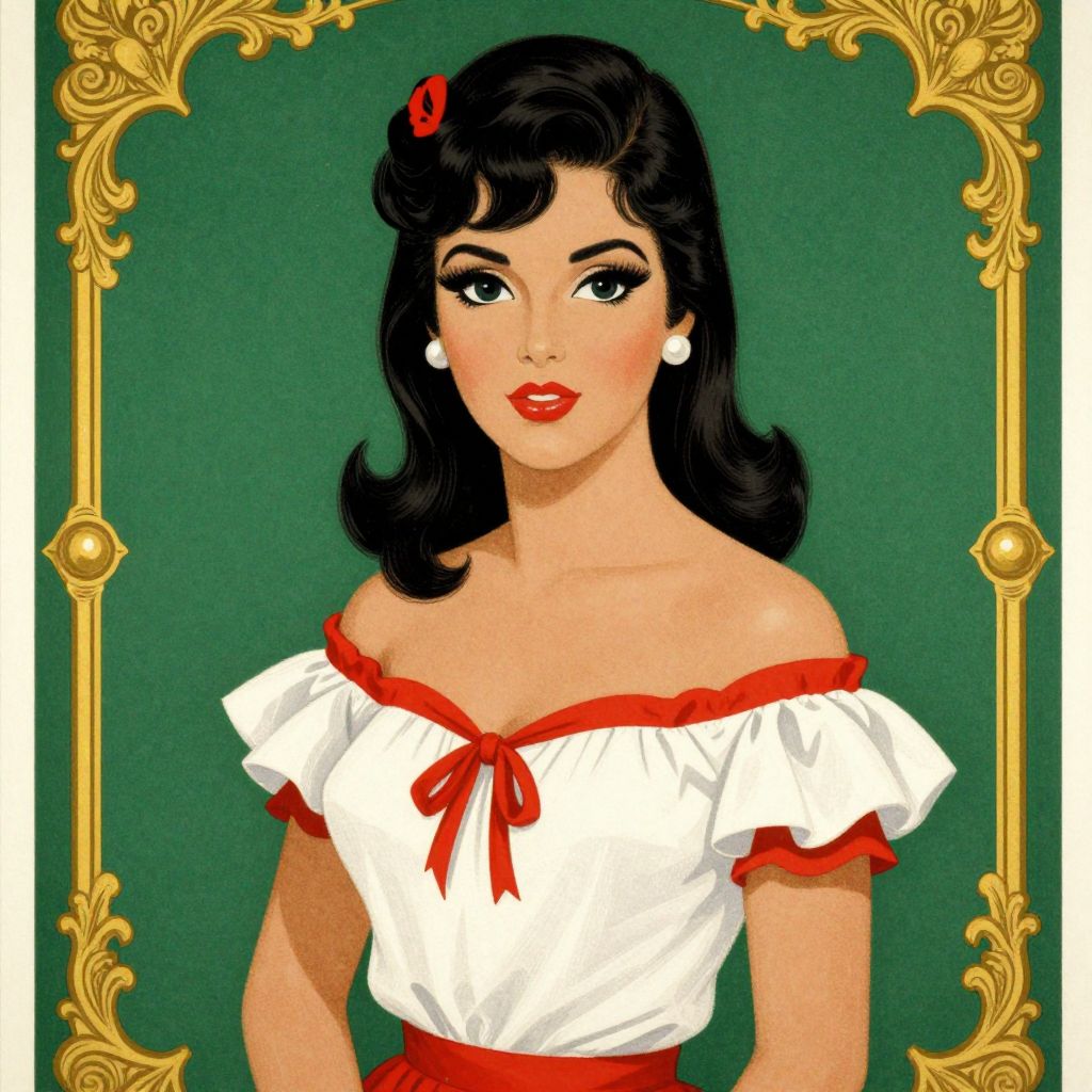A vibrant retro-style illustration reminiscent of Jesus Helguera's iconic calendar girl posters from the mid-20th century, featuring a woman in a charming white and red off-the-shoulder top with ruffled sleeves, set against a rich green background framed by ornate gold detailing.