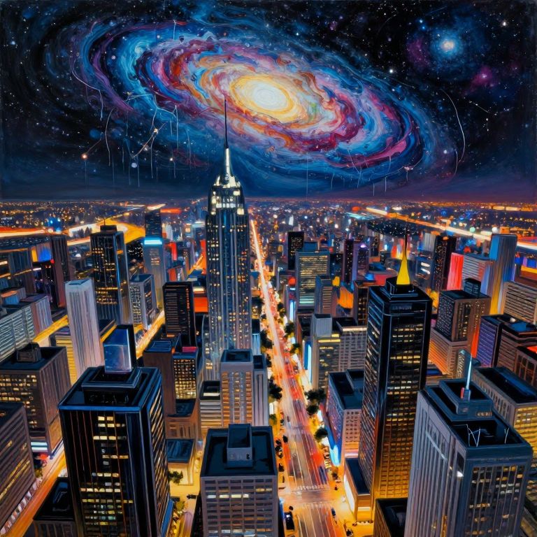 Digital art: Vibrant cityscape at night with glowing skyscrapers, colorful streetlights, and a surreal, swirling galaxy in the starry sky