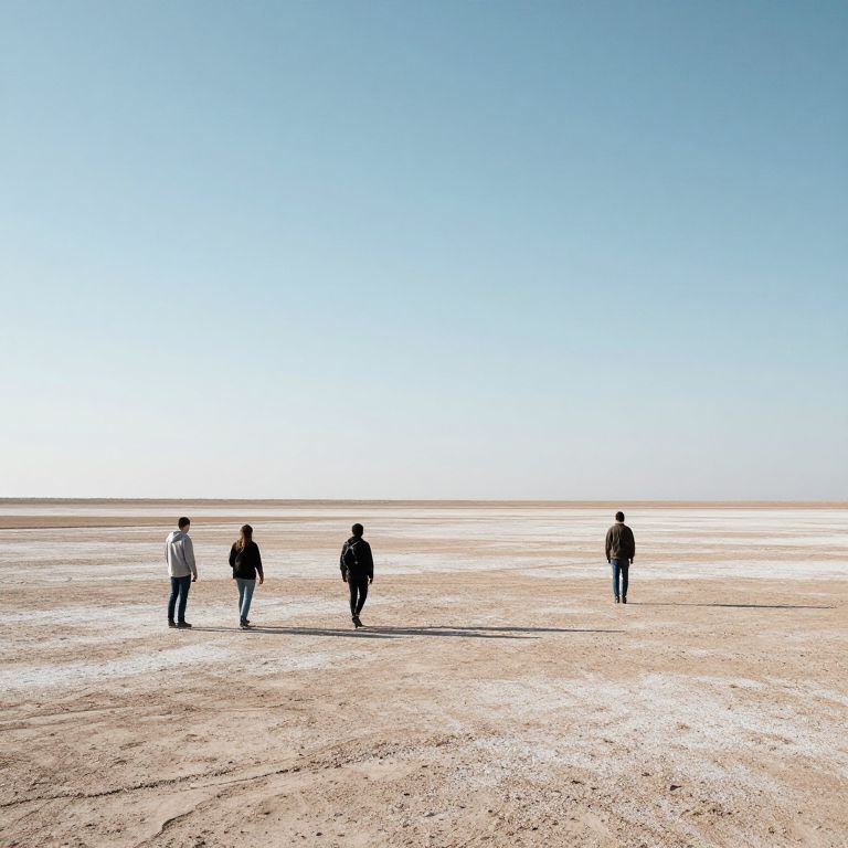 Photograph of a vast, empty, sandy landscape under a clear, bright blue sky. Four people, silhouetted against the horizon, walk in a line from left to right. They are dressed in dark, winter clothing, with jackets and pants. The ground is flat, with scattered patches of white salt or sand. The people cast long shadows on the sandy surface, emphasizing the brightness of the midday sun. The horizon is distant, blending into the sky, giving a sense of infinite space. The overall composition is minimalist, highlighting the isolation and vastness of the scene.