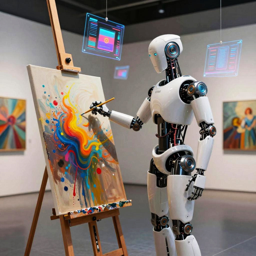 Use AI to generate art of a humanoid robot painting a grand canvas in an ultra-modern gallery, surrounded by floating holographic art tools and colorful splashes, expressive brush strokes, photorealistic with sci-fi atmosphere and mood lighting.