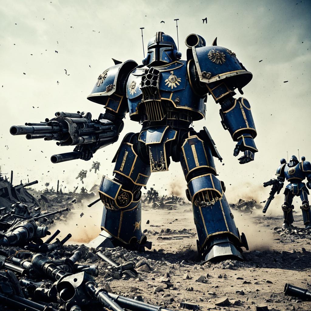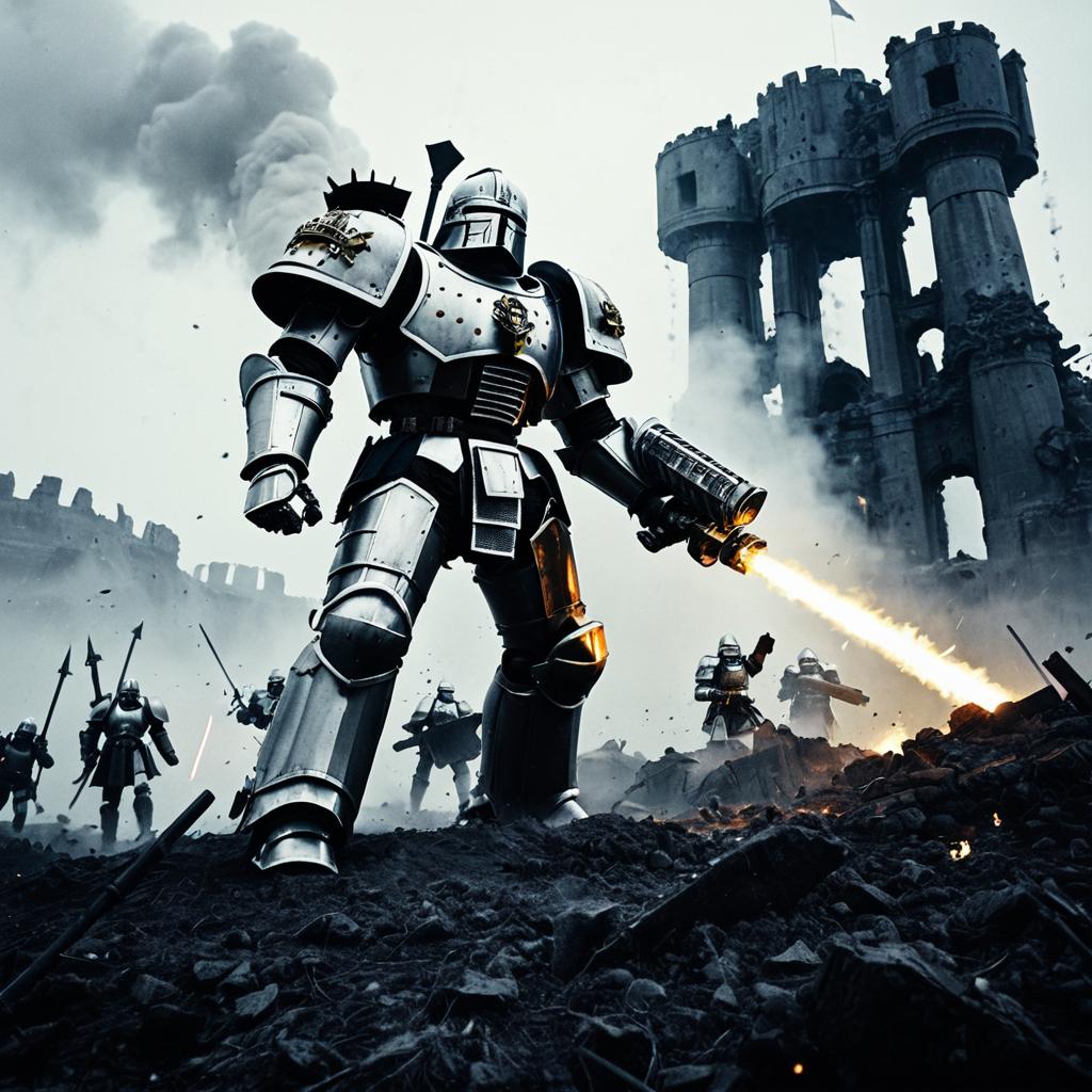 Dynamic battle scene featuring an Imperial Knight towering over the battlefield, with an electrified halberd, in a cratered icy tundra, with sparking mechanical rubble.