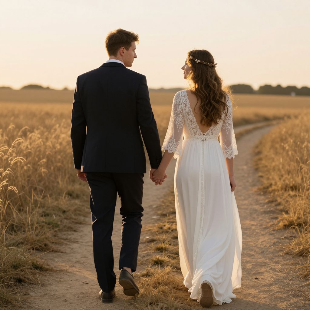 Two individuals walk hand-in-hand along a dirt path through a golden field at sunset, with the man dressed in a dark suit and the woman wearing a flowing white bohemian-style wedding dress featuring lace detailing and three-quarter sleeves, exuding soft romantic vibes.