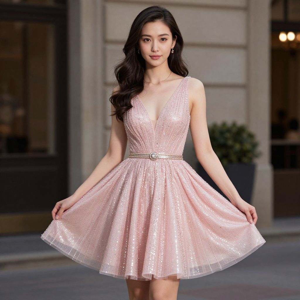 "Sparkle Birthday Dress, a woman in a pink dress posing for a picture"
