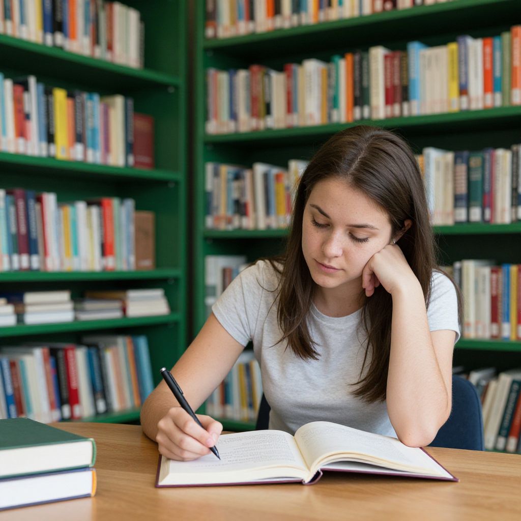 Focused woman studying intently in a library, surrounded by tall green bookshelves filled with colorful books, while writing notes in an open book on a wooden desk.