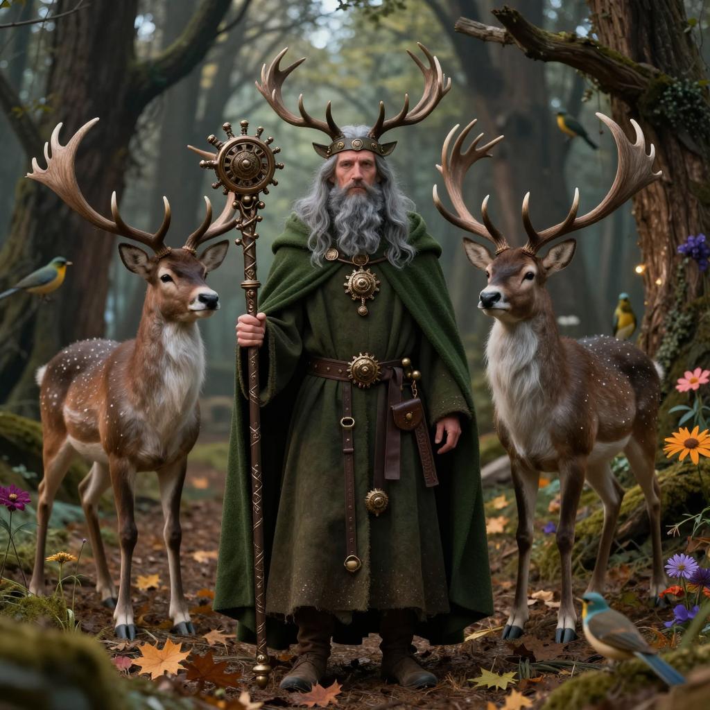 A mystical druid with long gray hair and beard, wearing a green cloak and antler headdress, stands holding a steampunk-inspired staff. He is surrounded by two enchanted stags with notable antlers in a magical forest setting. The scene incorporates intricate wood textures, autumn leaves on the ground, birds, and flowers, evoking a fairyland atmosphere inspired by fantasy art.