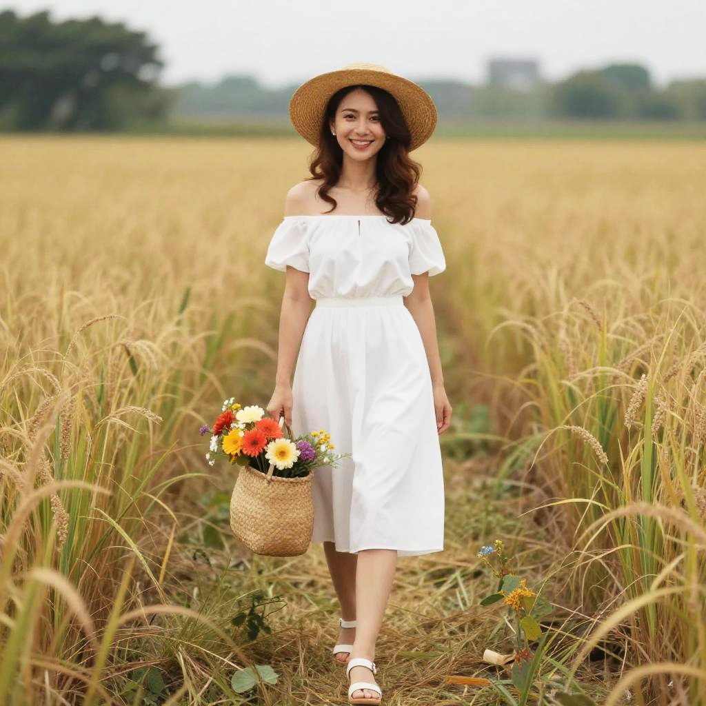 Photograph of a smiling Asian woman with wavy, shoulder-length brown hair, standing in a golden field of tall grass. She's wearing a white off-the-shoulder dress, white sandals, and a large straw hat. She holds a woven basket with a colorful bouquet. The background shows a blurry, tree-lined horizon. The image has a soft, warm color palette.