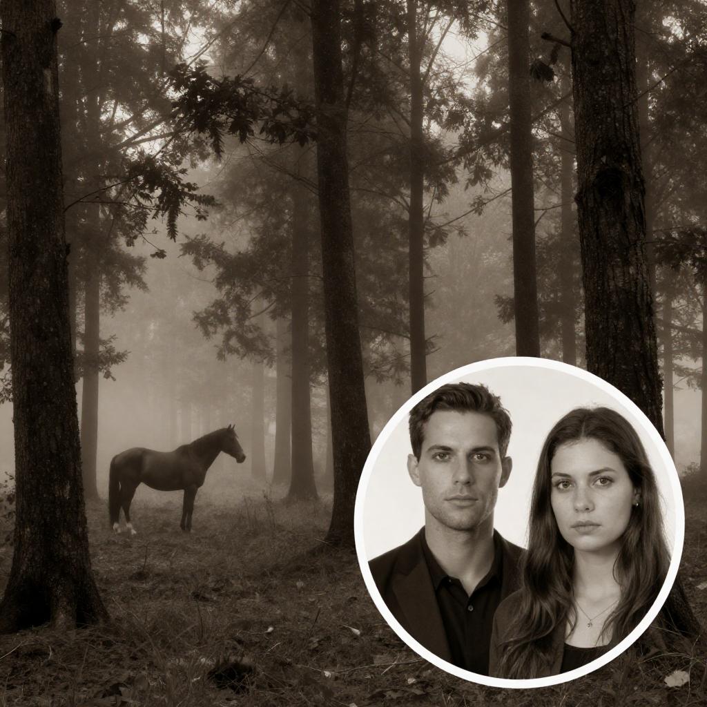 Sepia-toned photograph of a forest with tall, dark trees. In the foreground, a circular inset shows a man and woman with serious expressions. To the left, a horse stands in the distance. The background has a misty, ethereal quality. The man has short hair, and the woman has long hair.