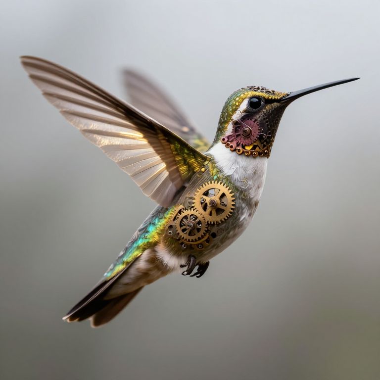 A steampunk-inspired hummingbird, adorned with intricate mechanical cogs and gears, hovers gracefully against a misty backdrop, its translucent wings shimmering with golden light.