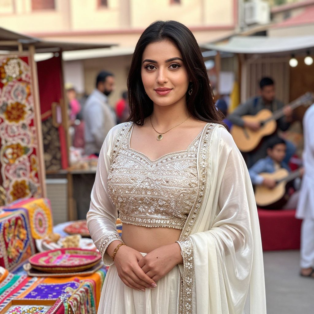 A photograph of a young South Asian woman with long black hair, wearing a white embroidered traditional lehenga choli with a lace-trimmed crop top. She has a medium build, fair skin, and a subtle smile. She stands in a vibrant market, with colorful textiles and a blurred background featuring people and a musician playing a guitar. She wears a gold necklace and bracelet, and the market stalls have bright, patterned fabrics. The image has a slight digital enhancement, emphasizing the colors and details.