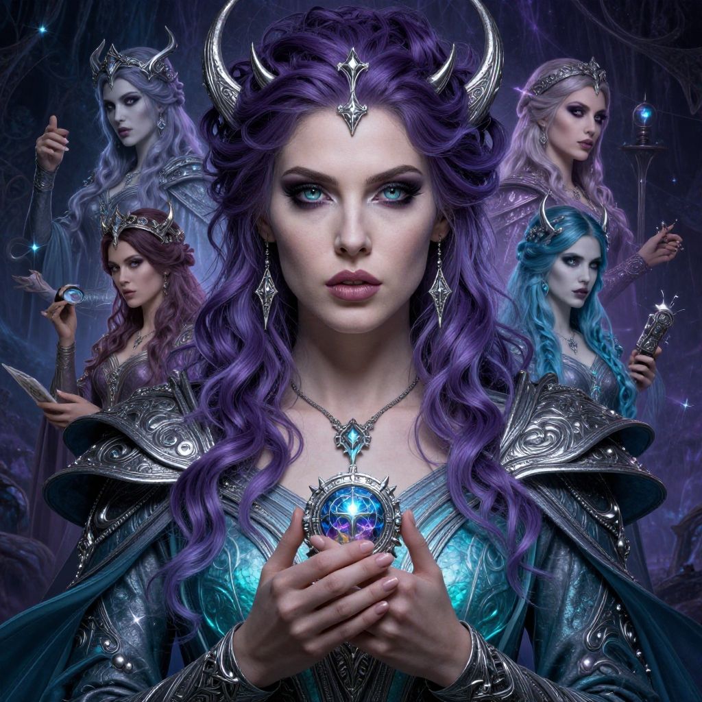 Digital fantasy artwork depicting a central female figure with long, wavy purple hair and blue eyes, wearing silver armor and a horned tiara. She holds a glowing blue gemstone pendant. Behind her, three other women with similar ethereal features and hairstyles, also in silver armor, stand in a mystical forest. The background is dark and starry, with intricate details on their armor and jewelry. The central figure's intense gaze and the gemstone's vibrant blue contrast with the dark, magical ambiance. The image has a hyper-realistic, magical fantasy style.