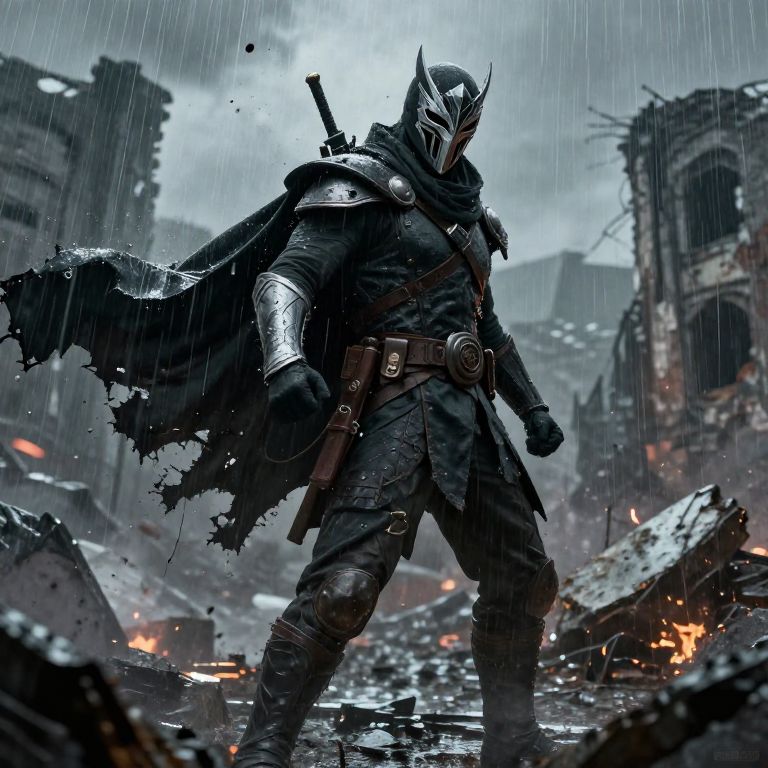 Masked vigilante concept art depicting a lone warrior standing amidst a rain-soaked battlefield, torn cape fluttering, intricate mask with sharp angular design, powerful stance suggesting resilience, detailed background with ruined buildings and scattered embers, epic and intense mood.