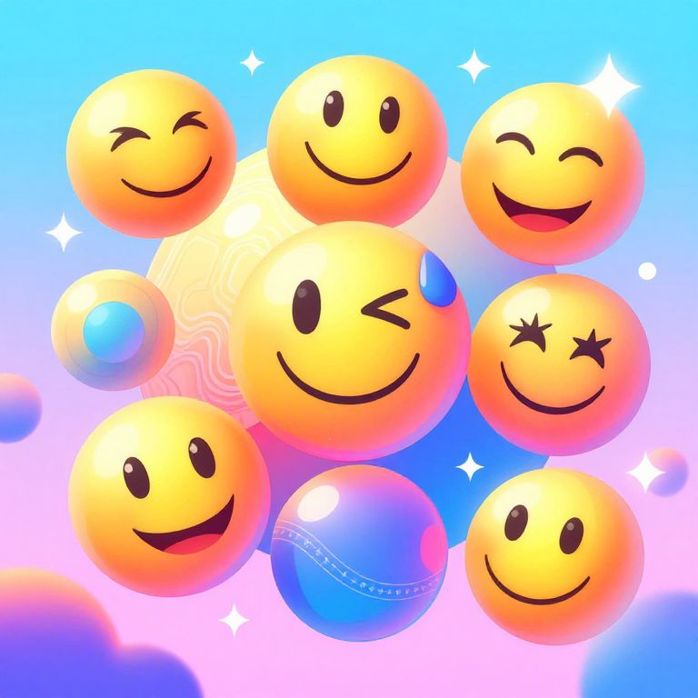Creative emoji illustration showcasing a mix of classic smiley features combined with surreal artistic patterns and neon gradients, floating in a whimsical dreamscape filled with geometric shapes and sparkling light effects, rendered with bold lines and smooth shading.