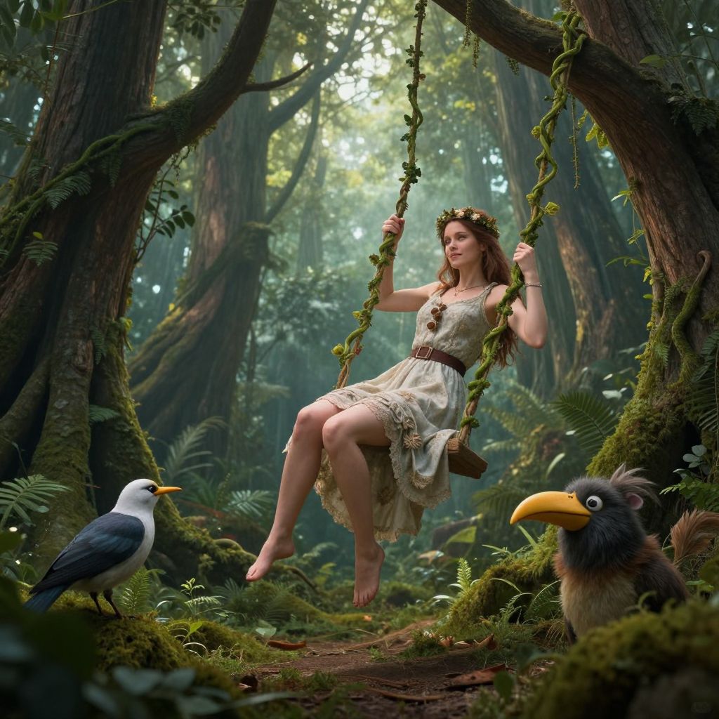 Around the woman, a group of colorful birds, each with unique features and vibrant plumage, fly and perch. There are at least six birds in total, each adding a splash of color to the scene. The birds are scattered throughout the image, some flying close to the woman, while others are perched on branches or nestled in the foliage. The interplay of colors—ranging from deep blues and greens to bright oranges and yellows—creates a magical and enchanting atmosphere. The overall composition is dynamic, with the woman at the center, surrounded by the birds and the forest, all of which are intricately detailed and richly textured. The scene is a harmonious blend of fantasy and nature, capturing a moment of serene beauty in an otherworldly landscape.