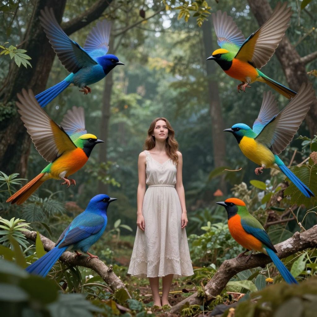 Enchanted Woman Surrounded by Colorful Birds
