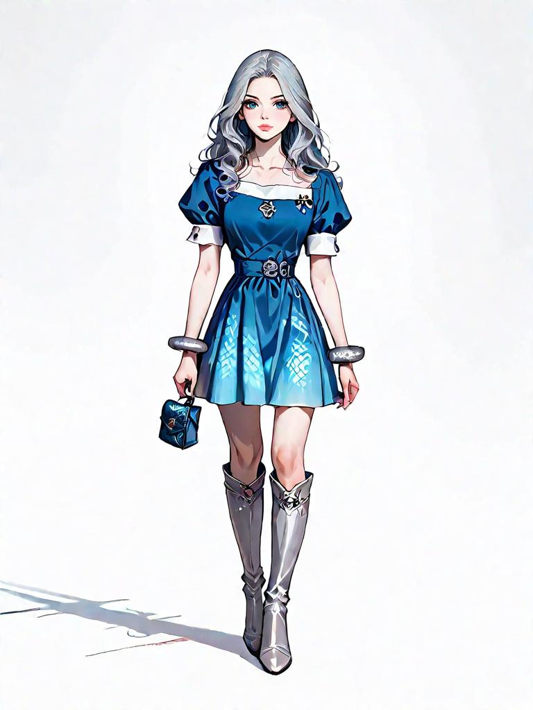 1girl, source_comics, realistic face, full body shot, Woman, bohemian chic, long white dress with red floral pattern, lace-up front with tassel ties, three-quarter sleeves, fitted waist with slight ruching, floor-length skirt, white background.