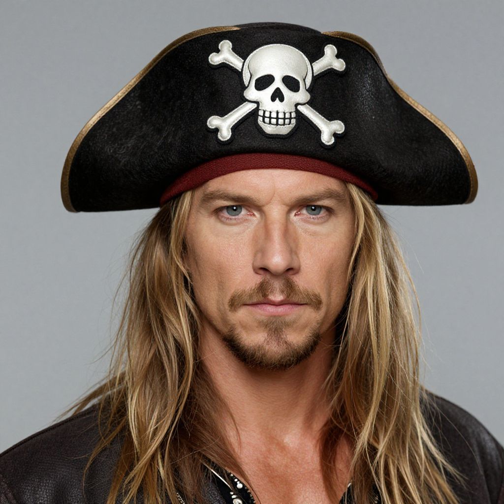 A man with long blonde hair is wearing a pirate hat with a skull and crossbones on it.