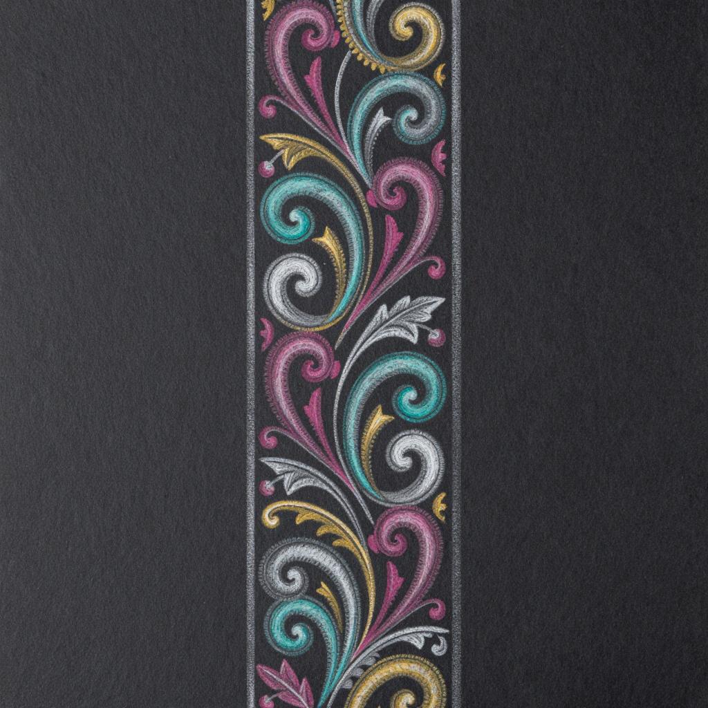 Scrollworks pattern featuring minimal neo-classical scrolls with restrained leaf forms in multicolor scrollwork blending teal, magenta and gold accents arranged as vertical panel of scrolls suitable for a book spine or column on aged parchment or manuscript page rendered as chalk drawing on dark slate surface, ultra-detailed, sharp ornamental design, high resolution, intricate decorative pattern art